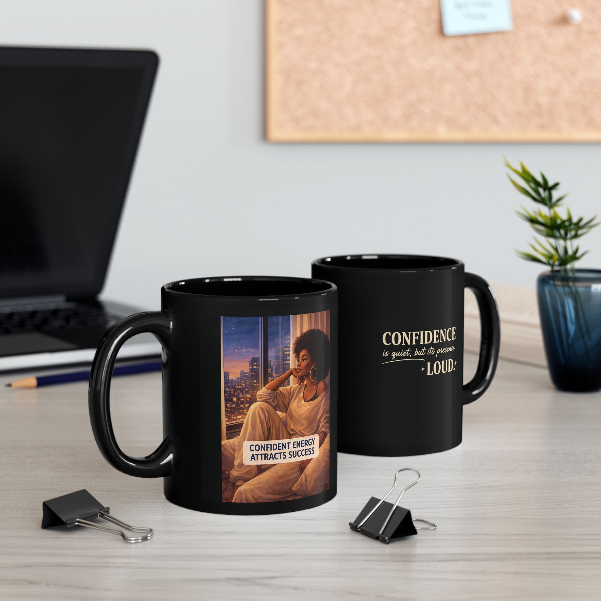 This glossy black ceramic mug holds quiet mornings and bold intentions. A relaxed young lady gazes out over a city at dusk while the message “Confident energy attracts success” anchors the scene — a daily reminder to breathe, own your room, and move with purpose. Warm coffee or evening tea looks striking against the deep black glaze, and the vivid print keeps its color through regular use. Slip this mug into your morning routine or set it on your desk as a steady nudge toward focused, confident days.